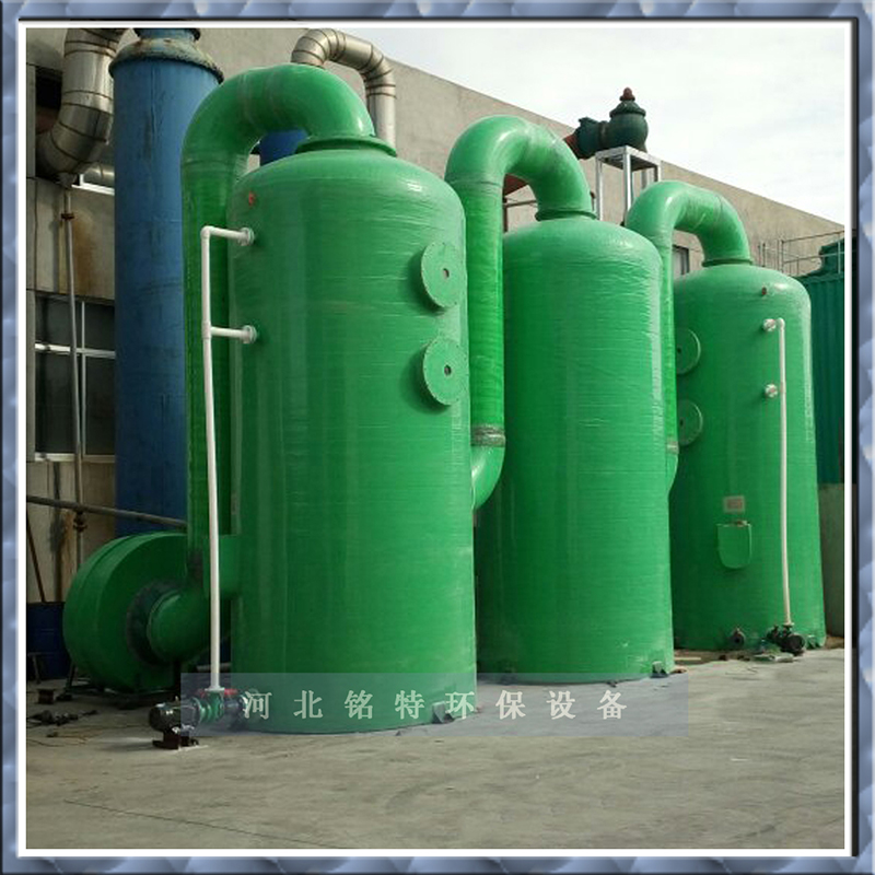 為濕法吸收型淨化設備(bèi),其功能(néng)設計為填料、噴淋分組分級式。當處理廢氣為酸性時,一般宜采用氫氧化鈉(NaOH)為吸收和液。當處理廢氣(qì)為(wéi)堿性時,一般用中性或偏酸性水進行洗滌。其工作原理為:廢氣由風機壓入洗滌塔內外向夾套組成的(de)均壓室,通過勻格柵使廢氣勻速進行一(yī)級填料功能段,進行一級(jí)噴淋(lín),使氣液二相得到一次(cì)充分接觸,經一級處理後(hòu)的廢氣用由(yóu)漸擴段減速進入二級填料噴淋功能段,再使廢氣得到更充分的氣液二相接觸反應,然(rán)後再經脫液器脫液除霧後(hòu),尾氣由排出口(kǒu)經風道排入大氣。